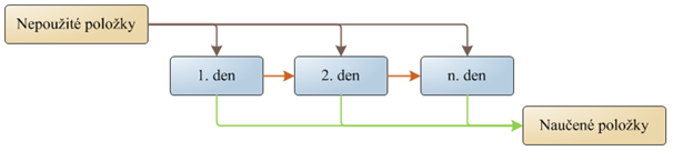 Nezapamatovaná slovíčka z jednoho dne přecházejí do dalšího dne, v každém dnu se počet položek doplní na např. 10 položek z nepoužitých položek. Pokud je položka vyhodnocena jako zapamatovaná odchází z učícího procesu do naučených položek.